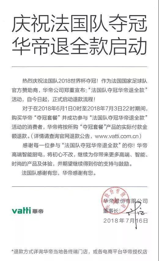 华帝凌晨公告,作为法国国家足球队官方赞助商,郑重宣布:“法国队夺冠,华帝退全款活动。”自今日起,正式启动退款流程。