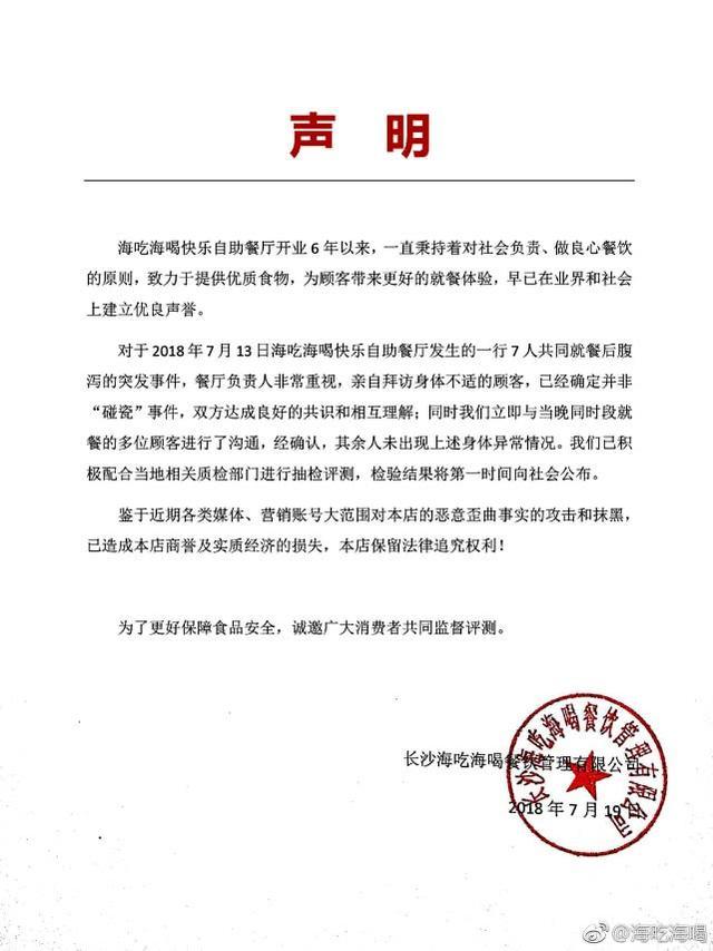 7月20日, 餐厅负责人发表声明称:餐厅一直秉持对社会负责、做良心餐饮的原则,致力于提供优质食物,为顾客带来更好的就餐体验,建立优良声誉。并表示餐厅负责人已亲自拜访不适的食客,并确定并非“碰瓷”事件,并表示双方已达成共识相互理解。同时,已与同时段其他用餐顾客进行沟通了,未发现有身体异常情况。也表示配合质监部门进行抽检,检验结果第一时间向社会公布。