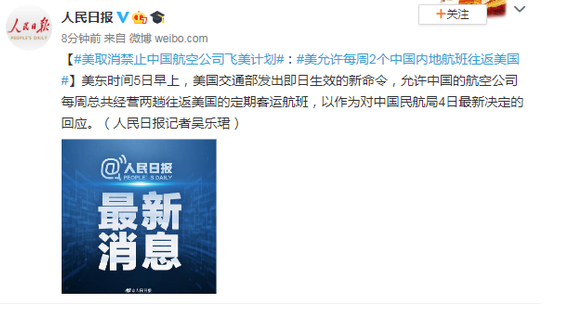 就在美国时间6月3日,美国交通部正式宣布暂停所有中国的航班。并且表明如果有必要这个计划会提前。谁知道就在当地时间6月5日美方政府宣布取消禁止中国客运航空公司飞往美国的计划。并且决定将允许中国航空每周飞往美国两次。(重型货架)