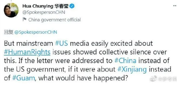 【如此双标?华春莹反问美国媒体:这次怎么就集体沉默了】4月7日,外交部发言人华春莹在推特上发布了联合国人权理事会3名特别报告员最近发布的一封致美国政府的联合指控函。这封信函指控美国政府和军方持续侵犯关岛查莫罗土著人的人权,对美国在没有与查莫罗人民进行充分协商的情况下在关岛加强军备,以及由此带来的对土著土地、资源、环境和文化权利的威胁表示严重关切。 华春莹还在推特上写道:“但是很容易对人权问题感到兴奋的美国主流媒体,对此却集体保持沉默。如果这封信是写给中国而不是美国政府,如果是写给新疆而不是关岛,会发生什么?”