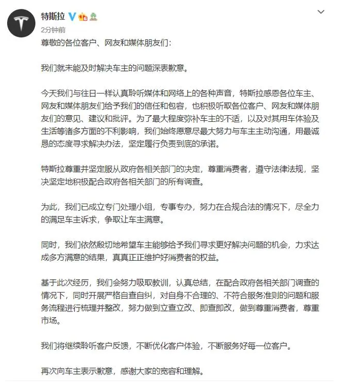 今天我们与往日一样认真聆听媒体和网络上的各种声音,特斯拉感恩各位车主、网友和媒体朋友们给予我们的信任和包容,也积极听取各位客户、网友和媒体朋友们的意见、建议和批评。为了最大程度弥补车主的不适,以及对其用车体验及生活等诸多方面的不利影响,我们始终愿意尽最大努力与车主主动沟通,用最诚恳的态度寻求解决办法,坚定履行负责到底的承诺。