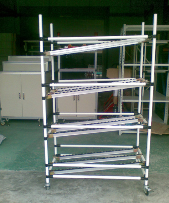 广州流利式货架广泛应用于制造业,商业,配送中心,装配车间以及出货频率较高的仓库流利式货架:采用辊轮铝合金,钣金等流利条,利用台架自重实现先进先出,存储方便,适用于装配线两侧配送中心等场所。