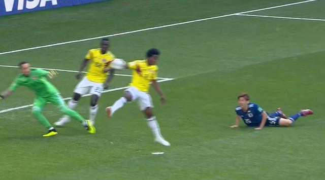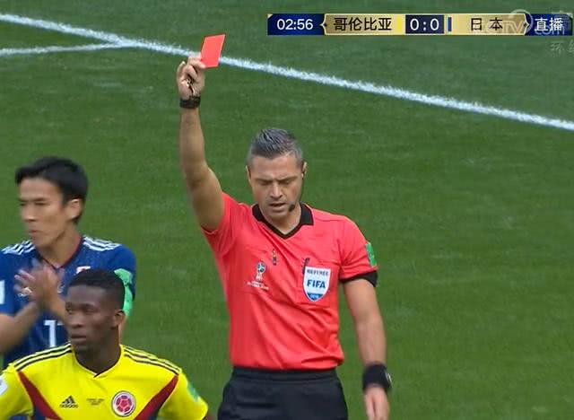 比赛进行第3分钟,日本队在哥伦比亚禁区外围打门,对手的球员在禁区内用手将球挡出,哥伦比亚吃红牌,日本队获得一点球,赢得良机。本次世界杯第一张红牌亮出。