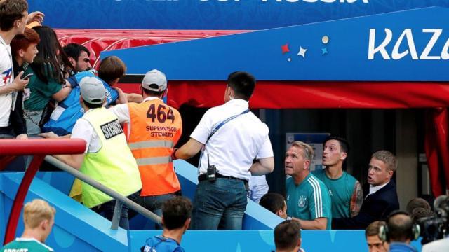 昨夜,德国人再次倒在了俄罗斯场上,0:2输给了韩国队后,卫冕冠军在小组垫底,被淘汰。赛后,输球的德国队员垂头丧气,径直走进了球员通道。但控制不了输球后的德国球迷心情不佳对他们辱骂,引发了厄齐尔心中的怒火,他原本已经进入更衣室了,却又冲出球员通道和场边球迷对喷起来,连工作人员都没拦住。