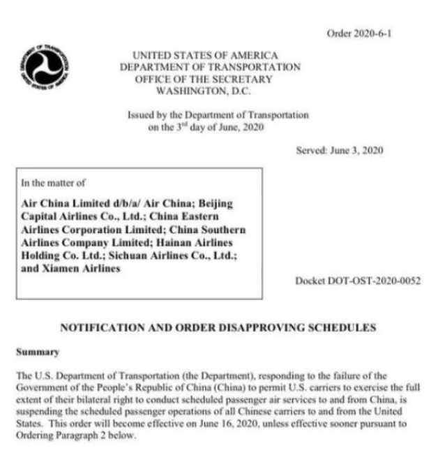 当地时间6月3日美国交通部正式宣布,因中方没有允许美国航空公司提供往来中国的服务,美方将暂停允许中国航空公司提供来往于美国的航班。并且表示到:相关规定从当地时间6月16日开始执行,但仍有可能提前。其实这一句是后话来的,为了特朗普看到情况不妙立刻改变政策。因为我们知道特朗普是美国总统里最善变的一个总统,从之前的退群就能知道,他是一个很能守信用的人,如果这个政策导致其他有损美国的经济和其他的话,他会立刻找一个理由,去更改相关的条例。