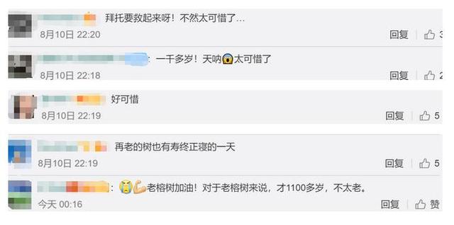 8月8日凌晨,广东河源一千年古榕树突然倒塌,5条枝干折断,无人员伤亡。当地封锁清理现场,调查倒塌原因并抢救古树。该树种植于唐代末年,树龄1100多年,树围13.8米,树高约20米,整树冠覆面积约3000平方米。